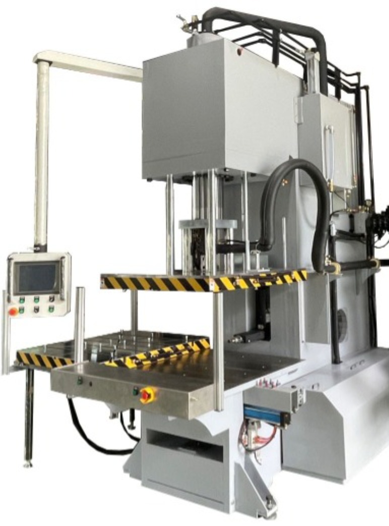 由C型機座組成機座,壓模板垂直上下移動對模具加壓。適用手推模具或自動模具。因壓模空間沒有立柱阻礙十分方便人員取蠟,同時特別適合有氣缸抽芯的模具,可自由進出壓模空間